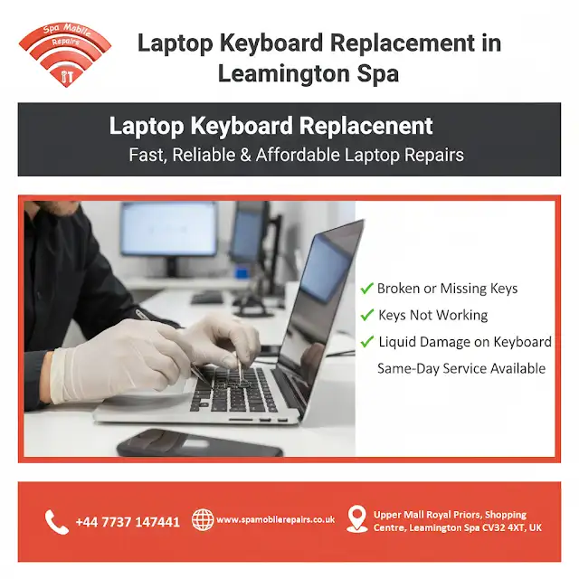 Is your laptop keyboard not working, missing keys, or damaged? Spa Mobile Repair offers fast and reliable laptop keyboard replacement in Leamington Spa for all major laptop brands. Our skilled technicians diagnose keyboard problems accurately and replace faulty or broken keyboards using high-quality parts. Whether it’s liquid damage, worn-out keys, or unresponsive buttons, we provide professional repairs with quick turnaround times. Trusted by local customers for affordable pricing, expert service, and friendly support, we make sure your laptop works like new again.